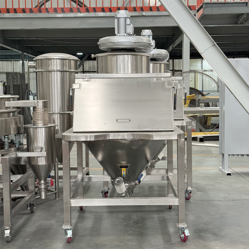 The core principle of its operation lies in the synergy of negative pressure dust removal and physical isolation: After the materials enter the feeding station, the built-in fan starts to operate, creating a stable negative pressure in the feeding hopper, which suppresses the flying dust with the directed airflow and draws it into the integrated filtration system, thus achieving the separation of dust from air. This equipment can significantly improve the workshop environment, reduce material loss, and ensure personnel health. It is widely used in industries such as food and chemical that have strict requirements for cleanliness.