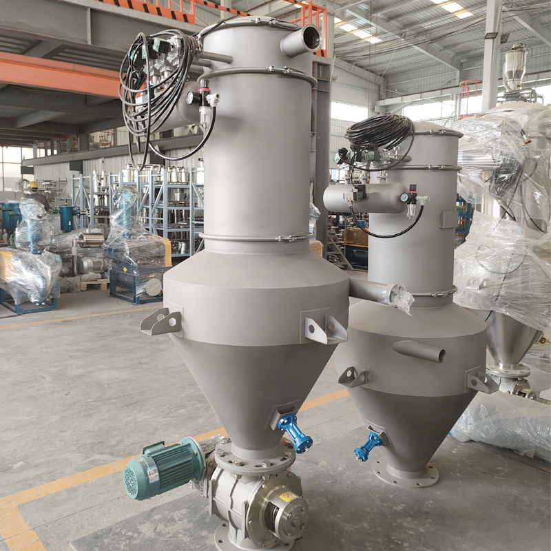 The working principle of the continuous vacuum feeding machine is to utilize the vacuum pump to generate negative pressure in the sealed separator, thereby sucking in the mixture of the material and air and achieving gas-solid separation through the filtration system. When the preset conditions are met, the system automatically cuts off the vacuum and introduces reverse blowing compressed air for vacuum breaking and filter element cleaning. At the same time, the bottom discharge valve is opened to allow the material to be discharged under the force of gravity.